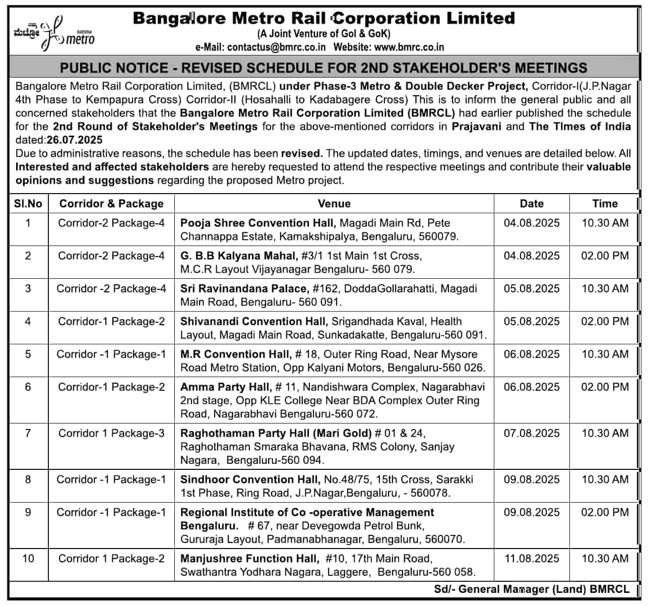 Property owners will receive individual communication through the KIADB. Additionally, notifications will be published in leading Kannada and English newspapers, and details will be available on the BMRCL website.